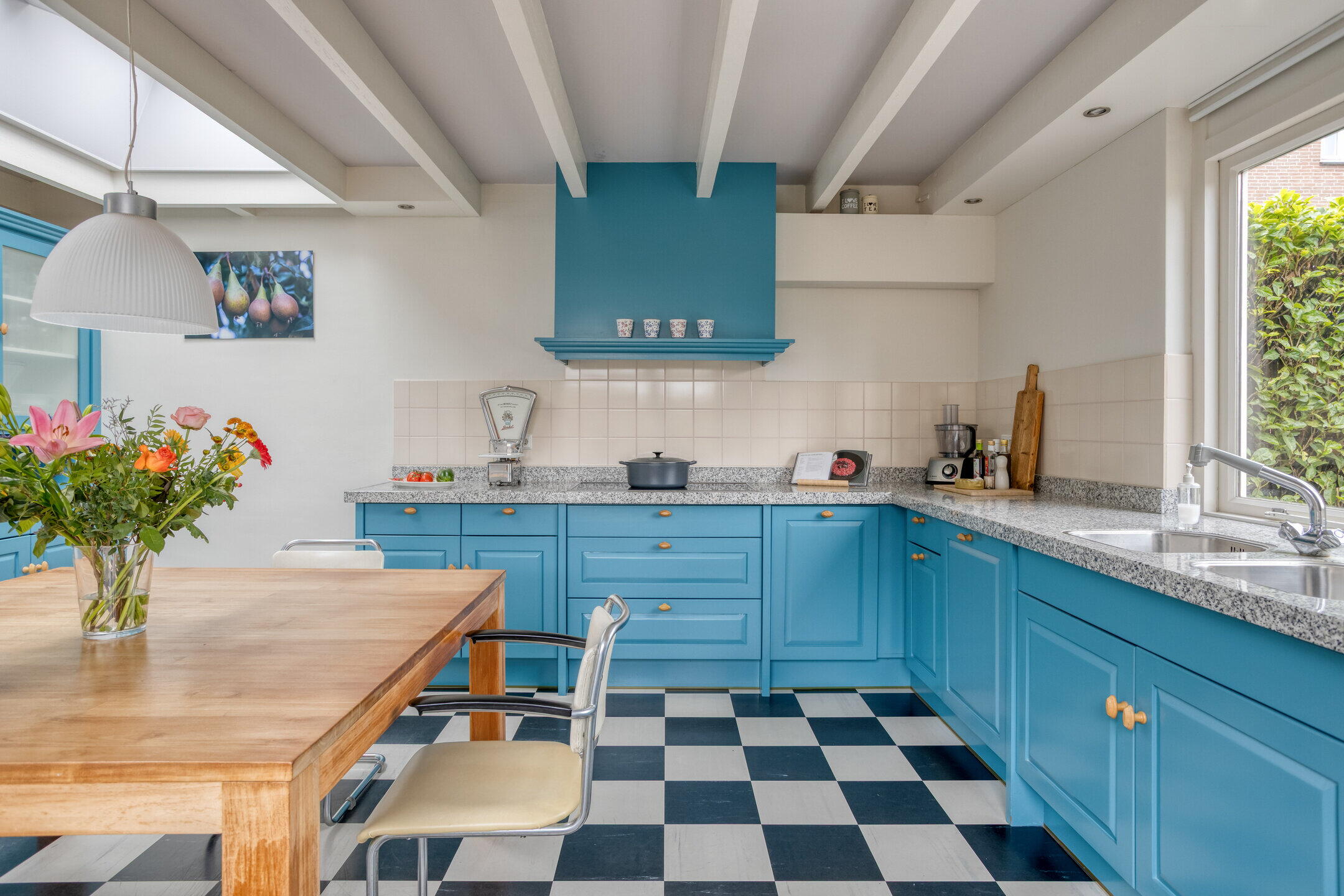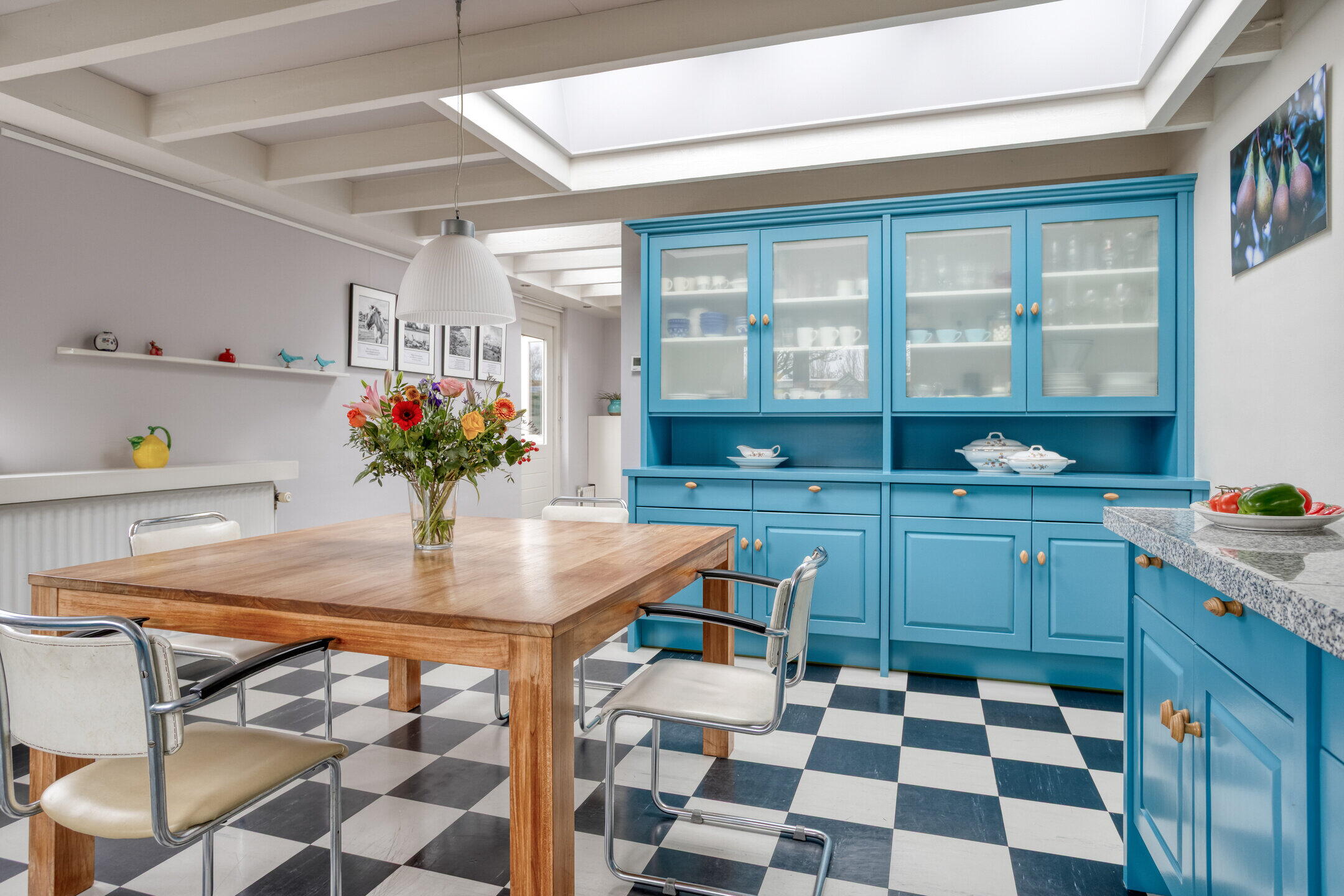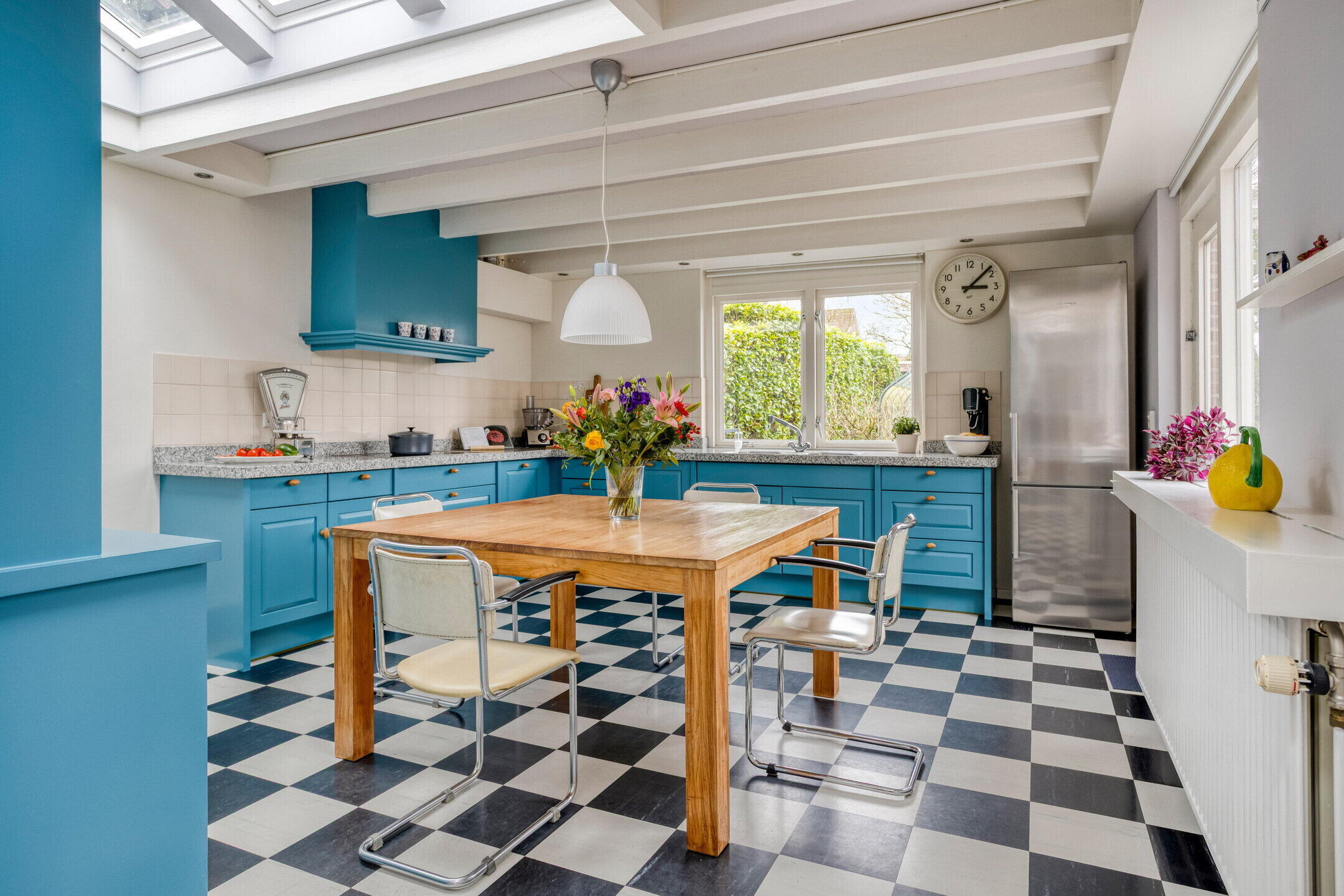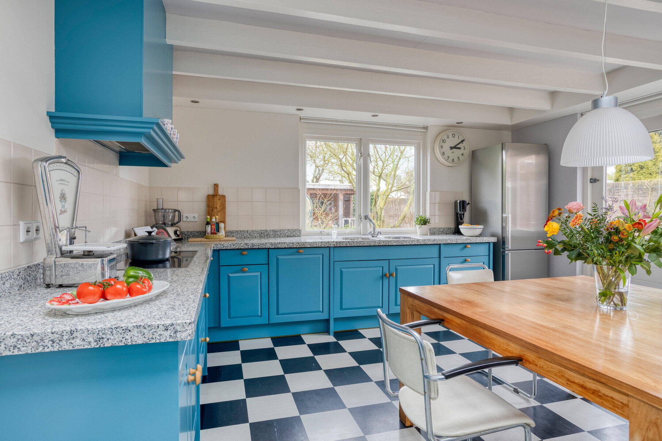 De gesloten keuken bevindt zich aan de achterzijde van de woning en is opgesteld in een hoekopstelling. De opvallende felblauwe kleur geeft karakter. Liever een neutralere uitstraling? Dan is dit eenvoudig aan te passen. De kasten in de keuken zijn van hout en zijn gemakkelijk over te schilderen, zo krijg je een compleet andere look. De keuken is voorzien van keramischekookplaat, afzuigkap en losse koelkast. Dankzij de dakramen geniet je hier van prachtige lichtinval. Er is bovendien ruimte voor een eettafel. Aangrenzend vind je de praktische bijkeuken met vaste inbouwkast, aansluitingen voor wasmachine en droger én een extra keukenblokje met wastafel. Vanuit hier heb je toegang tot de garage. Ook de garagedeur is in 2024 vernieuwd, een fijne onderhoudsplus. Daarnaast zijn de garage en bijkeuken beide voorzien dan dakramen waardoor deze veel natuurlijk licht bevatten.