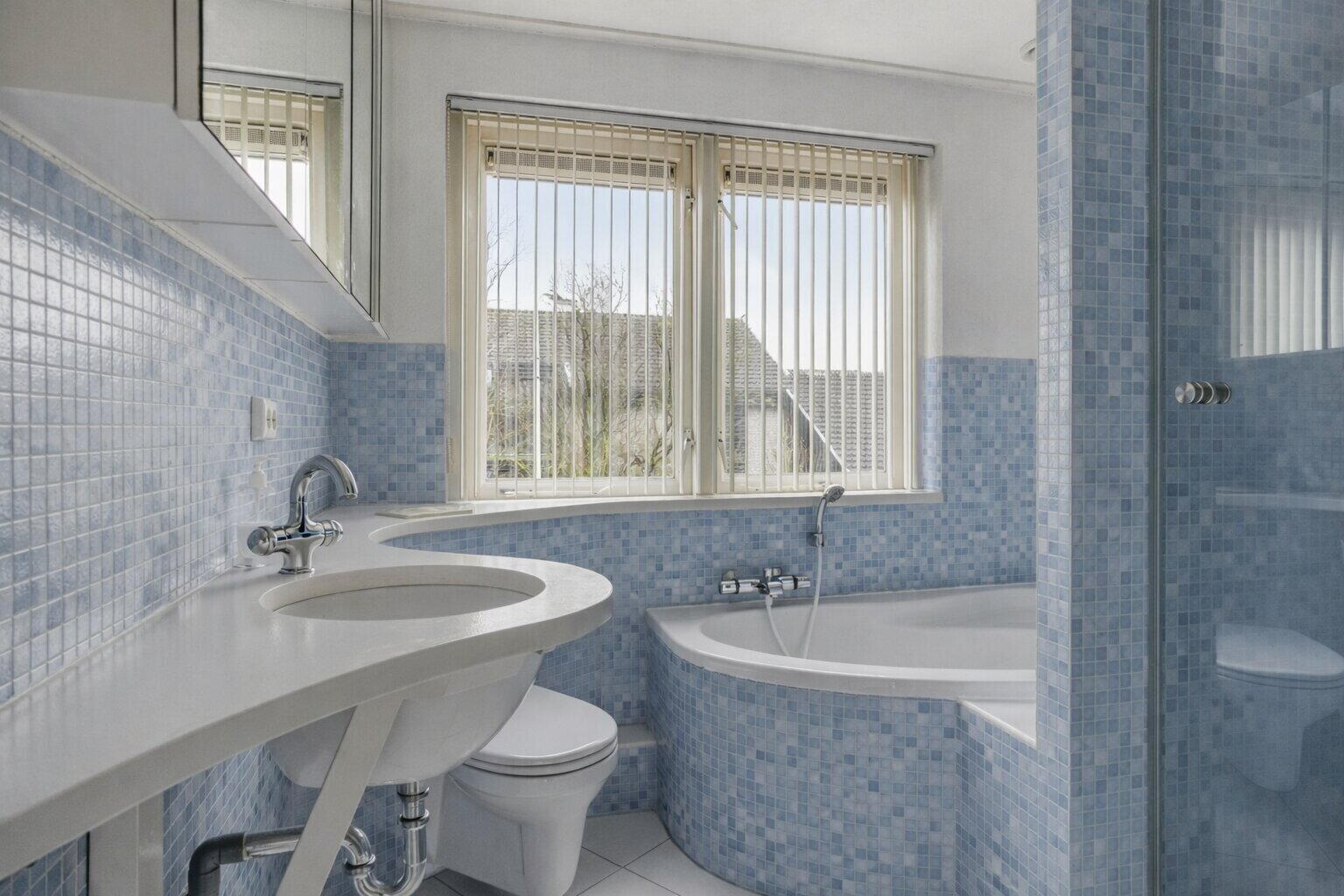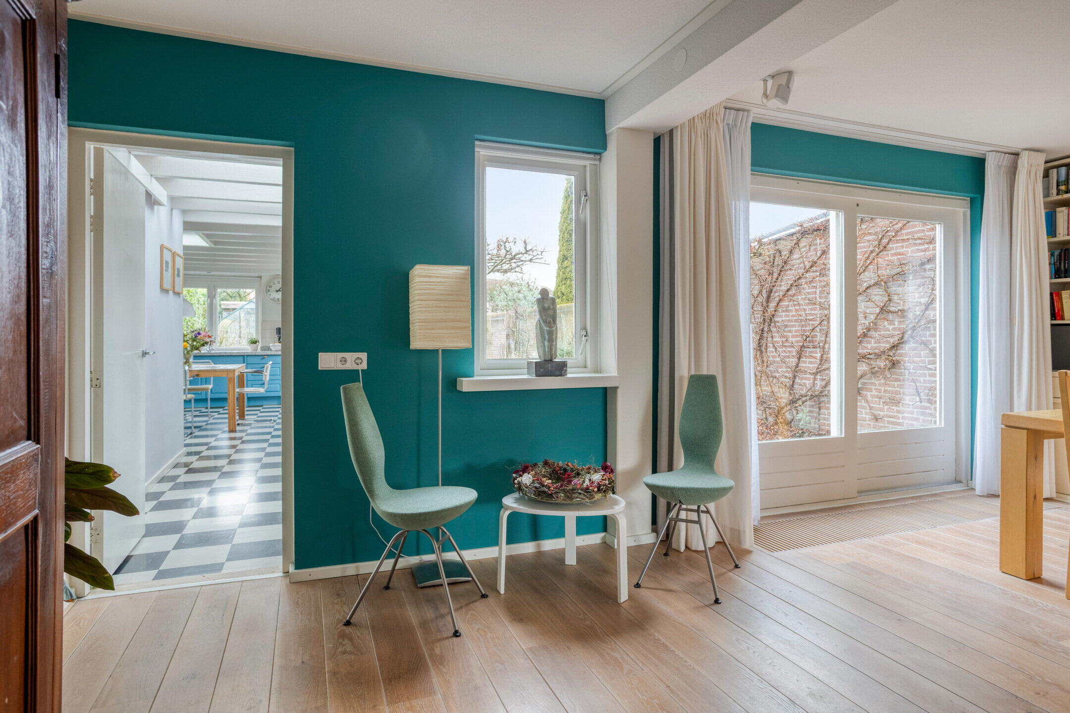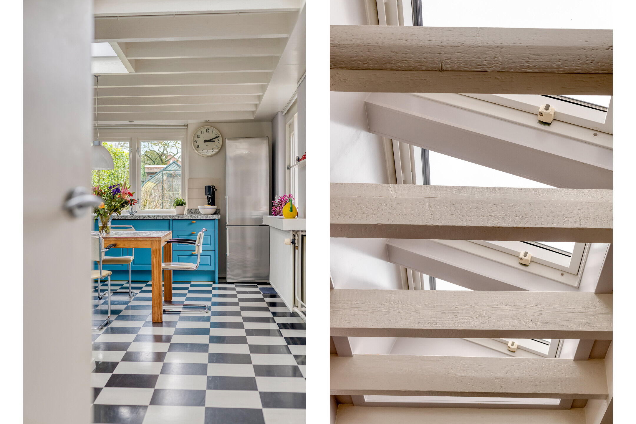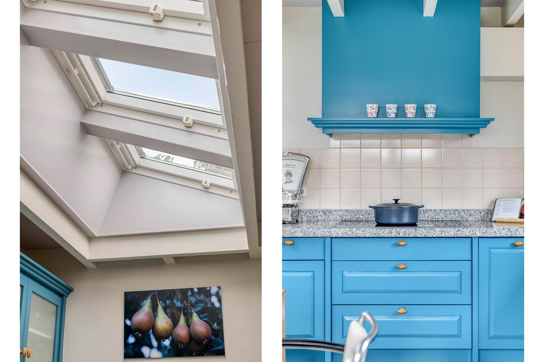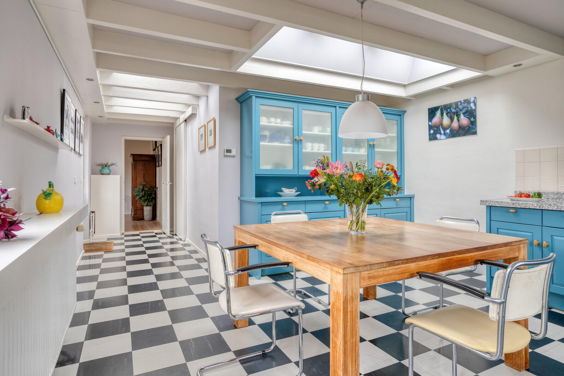 De gesloten keuken bevindt zich aan de achterzijde van de woning en is opgesteld in een hoekopstelling. De opvallende felblauwe kleur geeft karakter. Liever een neutralere uitstraling? Dan is dit eenvoudig aan te passen. De kasten in de keuken zijn van hout en zijn gemakkelijk over te schilderen, zo krijg je een compleet andere look. De keuken is voorzien van keramischekookplaat, afzuigkap en losse koelkast. Dankzij de dakramen geniet je hier van prachtige lichtinval. Er is bovendien ruimte voor een eettafel. Aangrenzend vind je de praktische bijkeuken met vaste inbouwkast, aansluitingen voor wasmachine en droger én een extra keukenblokje met wastafel. Vanuit hier heb je toegang tot de garage. Ook de garagedeur is in 2024 vernieuwd, een fijne onderhoudsplus. Daarnaast zijn de garage en bijkeuken beide voorzien dan dakramen waardoor deze veel natuurlijk licht bevatten.