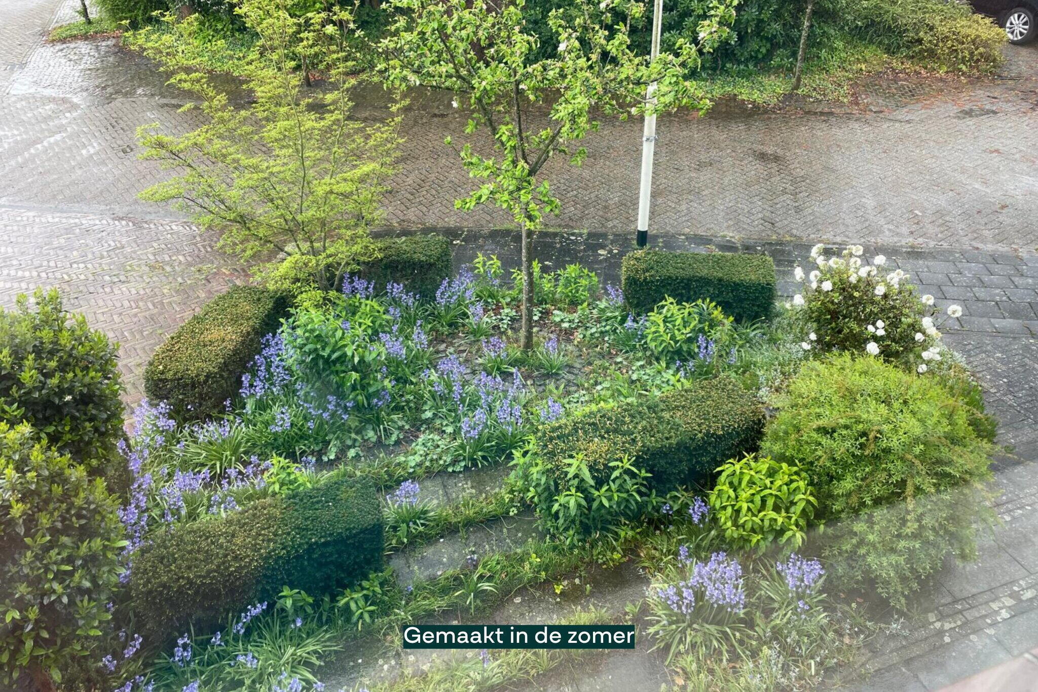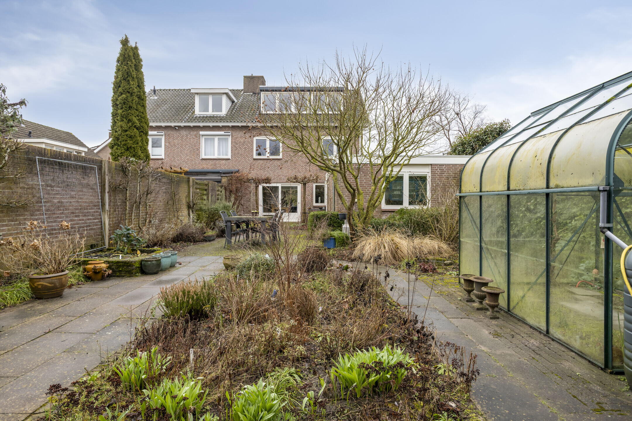 De achtertuin is een fijne mix van bestrating en groen. Met diverse plantenborders, veel beplanting zoals diverse fruitbomen en een kas voor de echte groenliefhebber is dit een tuin waar je écht kunt genieten.